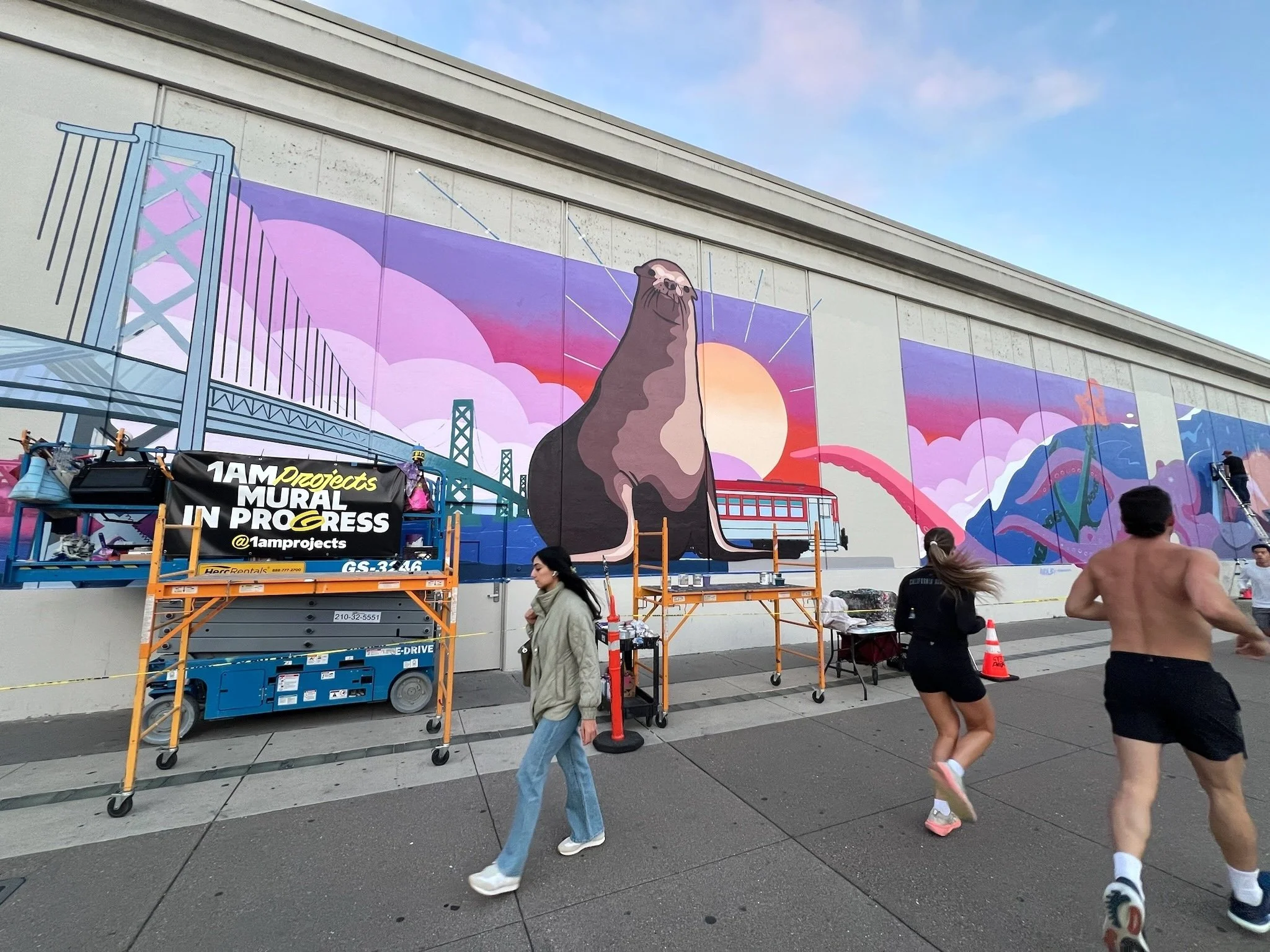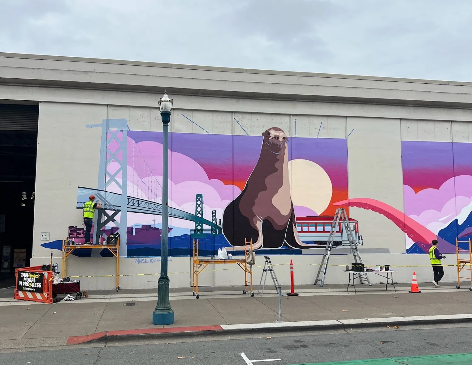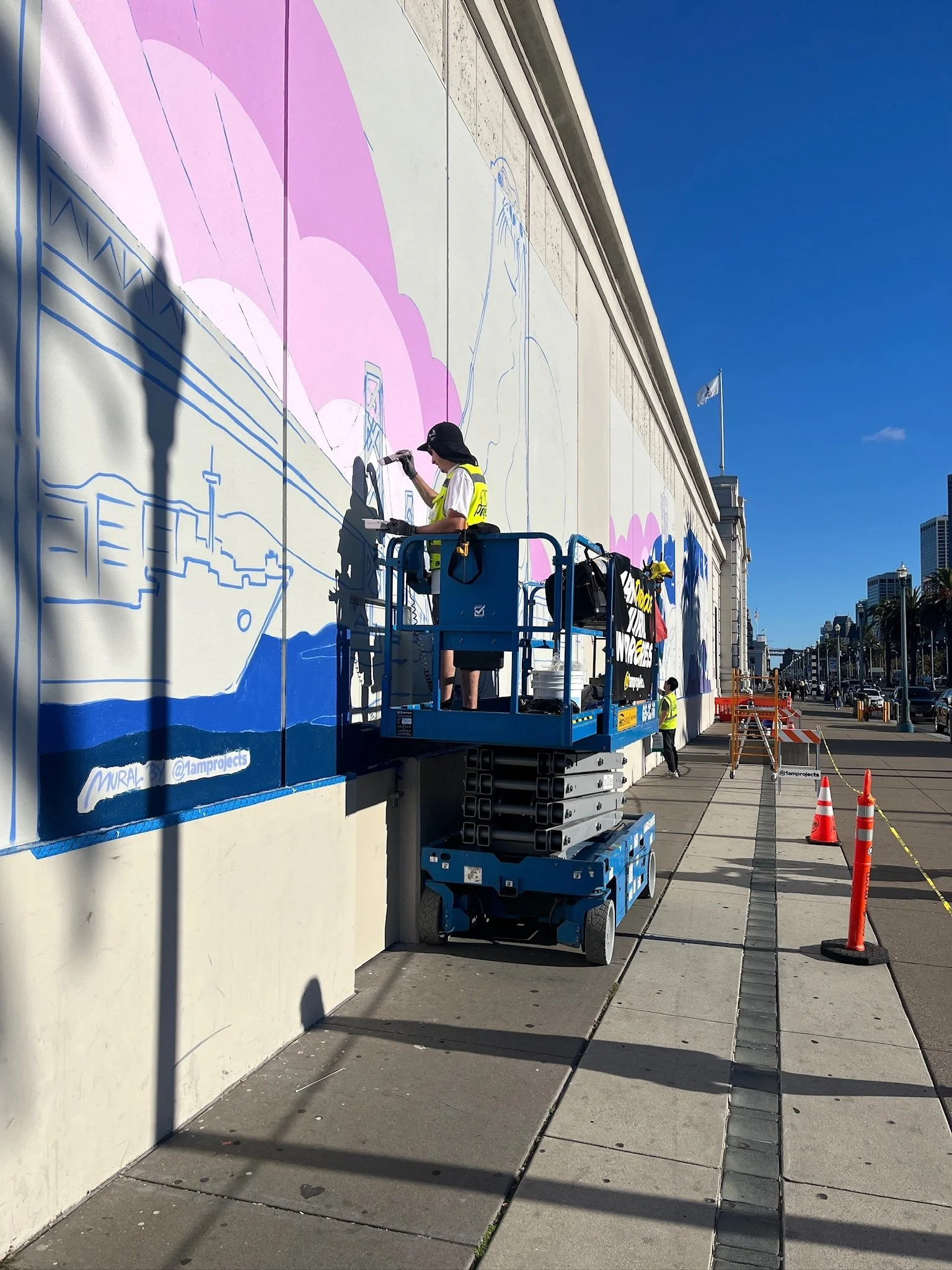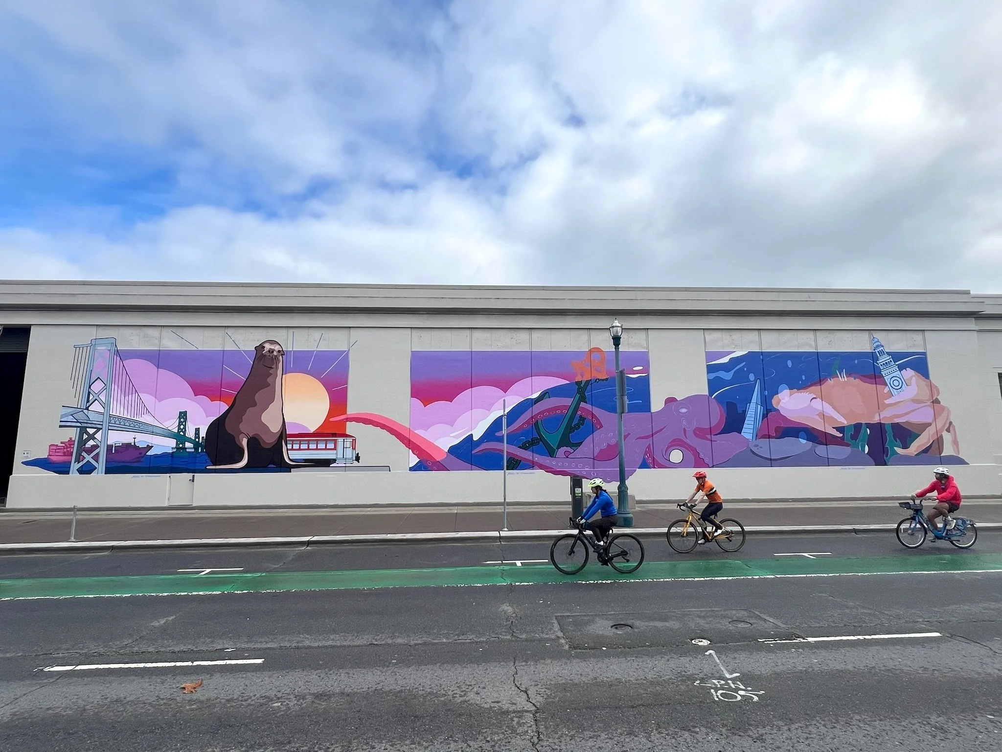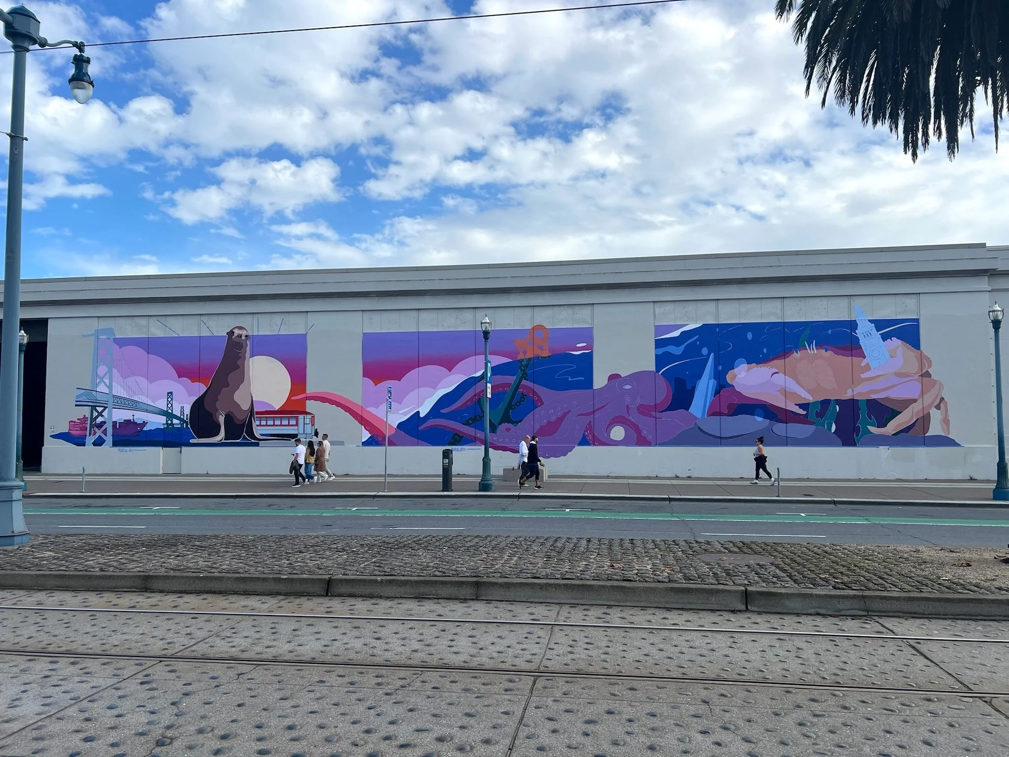 The design celebrates the diverse communities, history, and natural beauty of the San Francisco Bay. Rendered in a surreal, playful style across three large window-like panels, the mural highlights the stories and icons that define the waterfront.