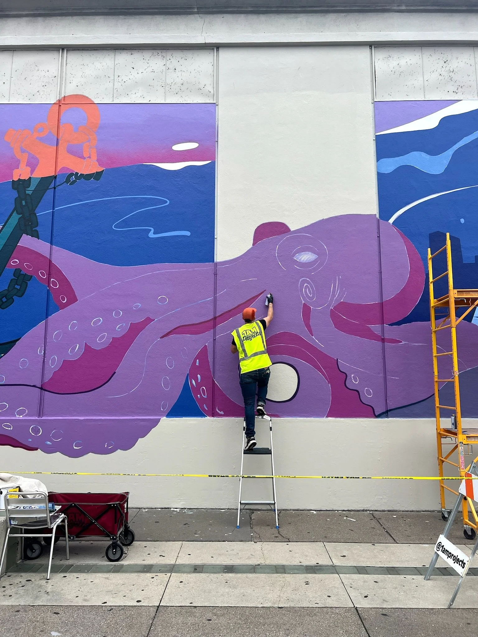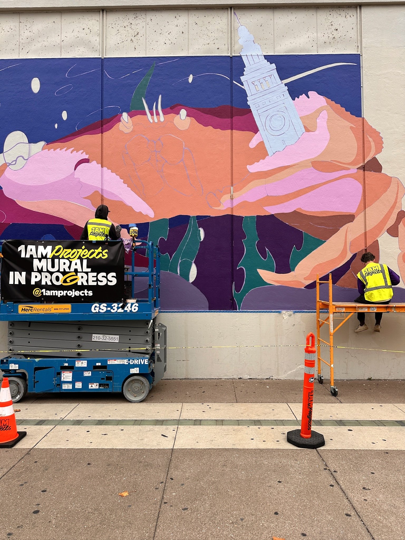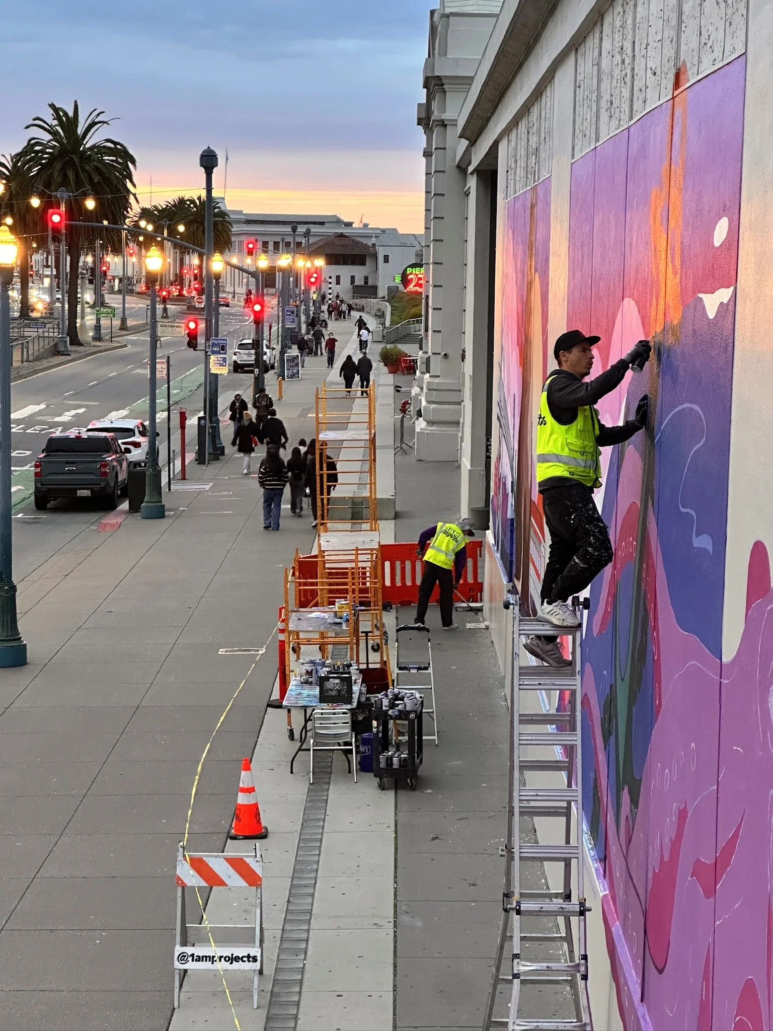 The mural “Beneath the Bay” is a community art project at Pier 19 on the Embarcadero, proposed and painted by 1AM Projects with support from the Port of San Francisco. The project is sponsored by Levi’s as part of These City Walls, a 25-mural initiative championing community art and local revitalization. Special mentions are Benjamin Moore & Co and RainguardPro for the paint and coatings.